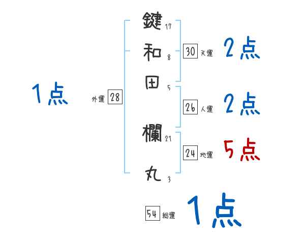 天運![]() | 鍵和田欄丸さんの天運は30画の2つ星!浮き沈みの激しさに注意しましょう。 家系が持つ宿命的な運勢を表します。祖先から受け継いだ苗字ですので自分の力が及びません。家柄を象徴します。 |