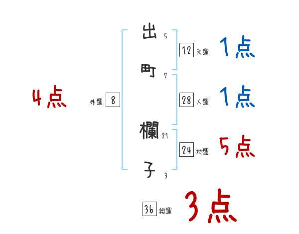 天運![]() | 出町欄子さんの天運は12画の1つ星!簡単な失敗で諦めてしまいやすいかも。着実に行動すると良いでしょう。 家系が持つ宿命的な運勢を表します。祖先から受け継いだ苗字ですので自分の力が及びません。家柄を象徴します。 |