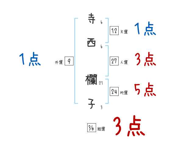 総運![]() | 寺西欄子さんの総運は36画の3つ星!先見性が豊かです。多少神経質で苦労することも。 あなたの人生を表す1番重要な運勢です。生涯を通じて影響する総合運となり、主に50歳以降の晩年期に影響を及ぼします。 |