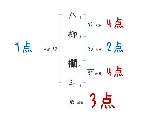 天運![]() | 八柳欄斗さんの天運は17画の4つ星!積極的な行動力。地位を気づき財産を手に入れる。純粋な心と直感力。 家系が持つ宿命的な運勢を表します。祖先から受け継いだ苗字ですので自分の力が及びません。家柄を象徴します。 |