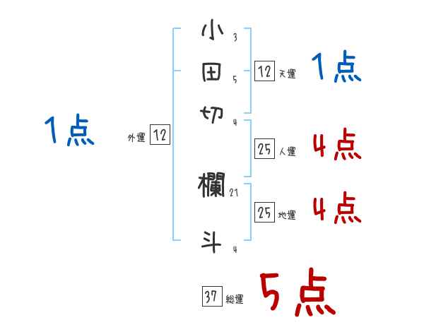 天運![]() | 小田切欄斗さんの天運は12画の1つ星!簡単な失敗で諦めてしまいやすいかも。着実に行動すると良いでしょう。 家系が持つ宿命的な運勢を表します。祖先から受け継いだ苗字ですので自分の力が及びません。家柄を象徴します。 |