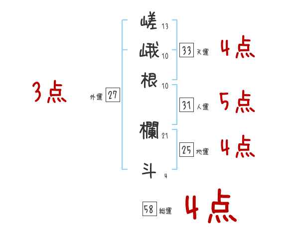天運![]() | 嵯峨根欄斗さんの天運は33画の4つ星!権力志向でプライドが高い。勇気があり運を切り開き成功する。 家系が持つ宿命的な運勢を表します。祖先から受け継いだ苗字ですので自分の力が及びません。家柄を象徴します。 |