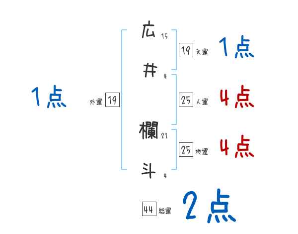 外運![]() | 広井欄斗さんの外運は19画の1つ星!優れた才能を持ちますが、協調性が足りないことも。周りの人と協力する事を意識しましょう。 生活面を象徴する運勢です。外部から受ける影響力を表し、結婚運、家庭運や職場、環境への順応性を表します。 |