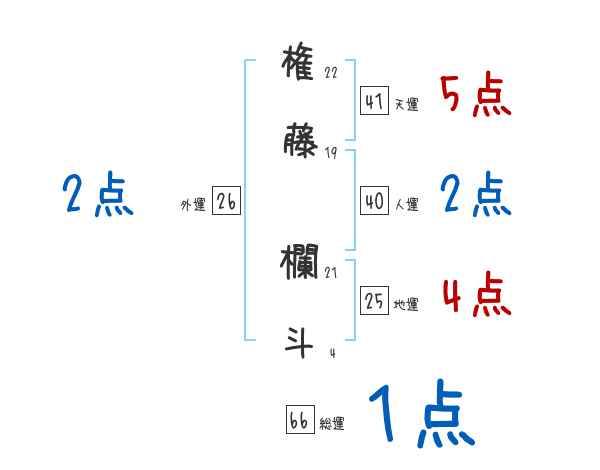 天運![]() | 権藤欄斗さんの天運は41画の5つ星!大志を抱き、目標に向かって実力を発揮し達成する。温和な性格。 家系が持つ宿命的な運勢を表します。祖先から受け継いだ苗字ですので自分の力が及びません。家柄を象徴します。 |