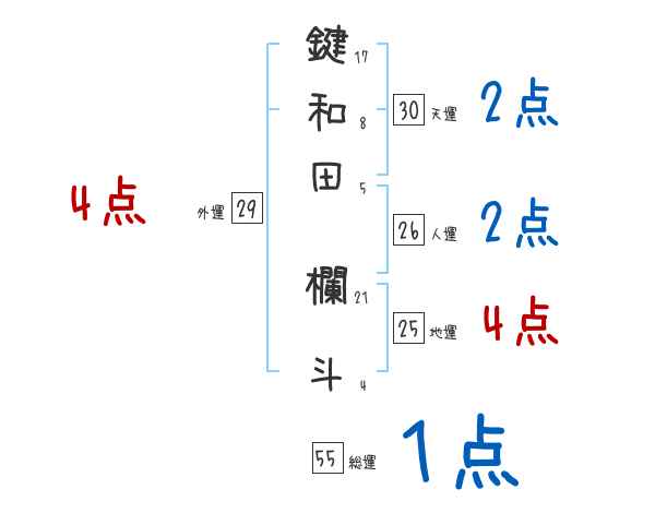 天運![]() | 鍵和田欄斗さんの天運は30画の2つ星!浮き沈みの激しさに注意しましょう。 家系が持つ宿命的な運勢を表します。祖先から受け継いだ苗字ですので自分の力が及びません。家柄を象徴します。 |