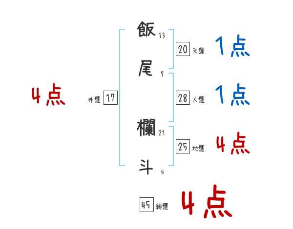 外運![]() | 飯尾欄斗さんの外運は17画の4つ星!積極的な行動力。地位を気づき財産を手に入れる。純粋な心と直感力。 生活面を象徴する運勢です。外部から受ける影響力を表し、結婚運、家庭運や職場、環境への順応性を表します。 |