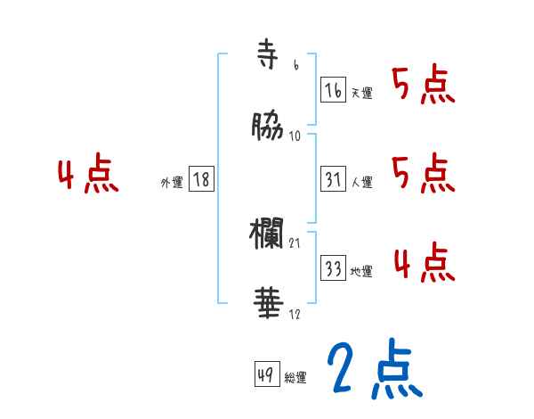 天運![]() | 寺脇欄華さんの天運は16画の5つ星!人望が厚く大きく発展する。逆転成功が見える。 家系が持つ宿命的な運勢を表します。祖先から受け継いだ苗字ですので自分の力が及びません。家柄を象徴します。 |