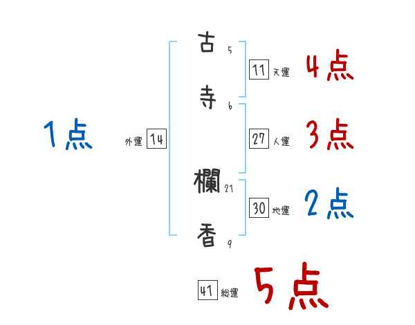 天運![]() | 古寺欄香さんの天運は11画の4つ星!着実に富や地位を得る幸運な人生。 家系が持つ宿命的な運勢を表します。祖先から受け継いだ苗字ですので自分の力が及びません。家柄を象徴します。 |