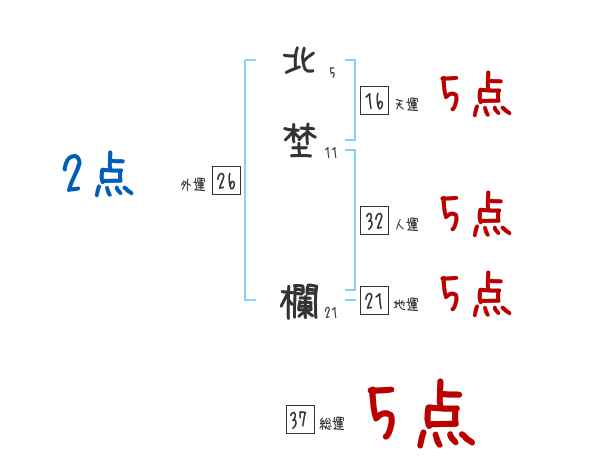 天運![]() | 北埜欄さんの天運は16画の5つ星!人望が厚く大きく発展する。逆転成功が見える。 家系が持つ宿命的な運勢を表します。祖先から受け継いだ苗字ですので自分の力が及びません。家柄を象徴します。 |