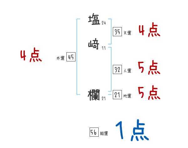 人運![]() | 塩﨑欄さんの人運は32画の5つ星!柔軟性があり成功する。チャンスが多く金運が良い。 性格や才能などを表す2番目に重要な運勢です。人間関係や協調性、社会的な成功に影響します。主に20歳から50歳ぐらいまでの中年期の運勢を表します。 |