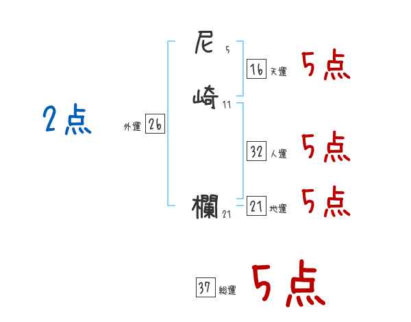 人運![]() | 尼崎欄さんの人運は32画の5つ星!柔軟性があり成功する。チャンスが多く金運が良い。 性格や才能などを表す2番目に重要な運勢です。人間関係や協調性、社会的な成功に影響します。主に20歳から50歳ぐらいまでの中年期の運勢を表します。 |