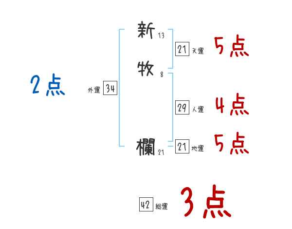 総運![]() | 新牧欄さんの総運は42画の3つ星!病気に注意。多芸であるが消極的でおとなしい。 あなたの人生を表す1番重要な運勢です。生涯を通じて影響する総合運となり、主に50歳以降の晩年期に影響を及ぼします。 |