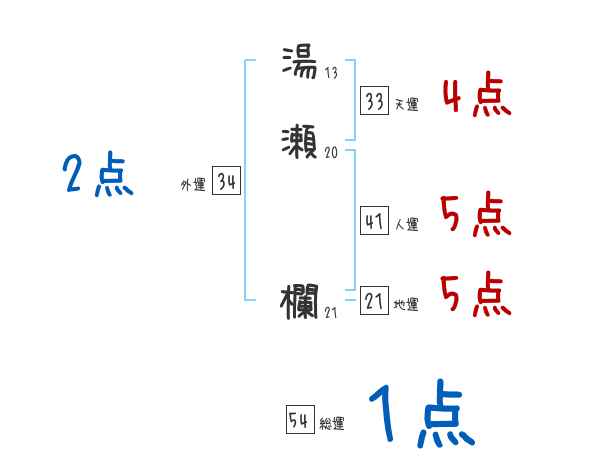 天運![]() | 湯瀬欄さんの天運は33画の4つ星!権力志向でプライドが高い。勇気があり運を切り開き成功する。 家系が持つ宿命的な運勢を表します。祖先から受け継いだ苗字ですので自分の力が及びません。家柄を象徴します。 |