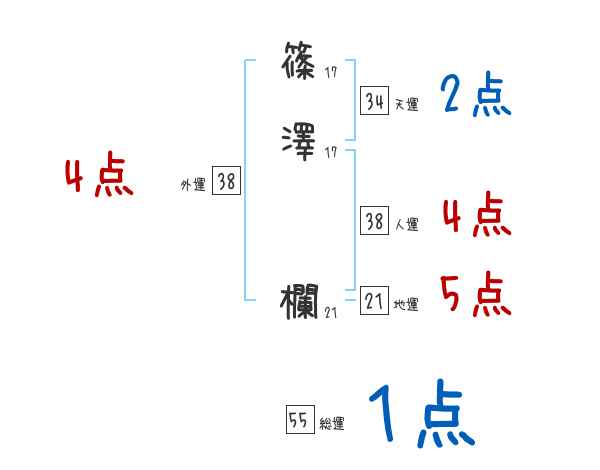 天運![]() | 篠澤欄さんの天運は34画の2つ星!独創性に優れるが、自尊心が強く災難に注意しましょう。 家系が持つ宿命的な運勢を表します。祖先から受け継いだ苗字ですので自分の力が及びません。家柄を象徴します。 |