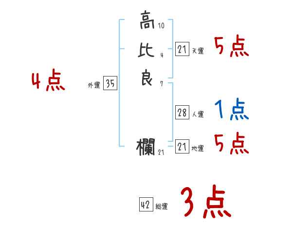 外運![]() | 高比良欄さんの外運は35画の4つ星!温厚な性格で感受性が高い。穏和な性格で人望が厚い。 生活面を象徴する運勢です。外部から受ける影響力を表し、結婚運、家庭運や職場、環境への順応性を表します。 |