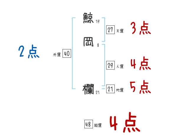 天運![]() | 鯨岡欄さんの天運は27画の3つ星!頭脳明晰だが強情で摩擦が多い傾向。孤立に注意。 家系が持つ宿命的な運勢を表します。祖先から受け継いだ苗字ですので自分の力が及びません。家柄を象徴します。 |