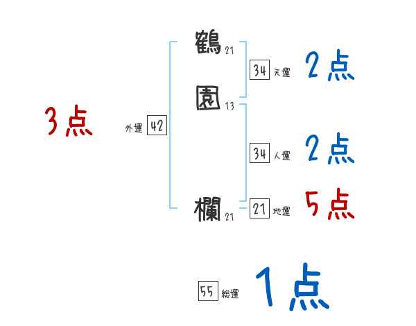 天運![]() | 鶴園欄さんの天運は34画の2つ星!独創性に優れるが、自尊心が強く災難に注意しましょう。 家系が持つ宿命的な運勢を表します。祖先から受け継いだ苗字ですので自分の力が及びません。家柄を象徴します。 |
