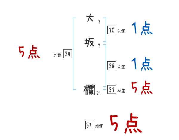 総運![]() | 大坂欄さんの総運は31画の5つ星!社交性があり判断力に優れる。順風満帆な人生で円満な生活。 あなたの人生を表す1番重要な運勢です。生涯を通じて影響する総合運となり、主に50歳以降の晩年期に影響を及ぼします。 |
