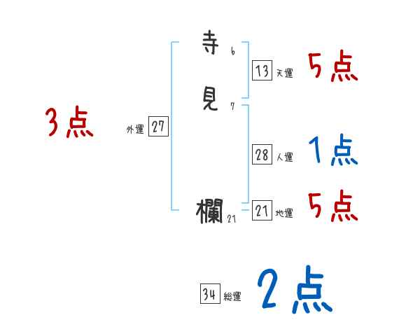 天運![]() | 寺見欄さんの天運は13画の5つ星!才能に恵まれ人気がある。名声を手に入れる。円満な人生。 家系が持つ宿命的な運勢を表します。祖先から受け継いだ苗字ですので自分の力が及びません。家柄を象徴します。 |