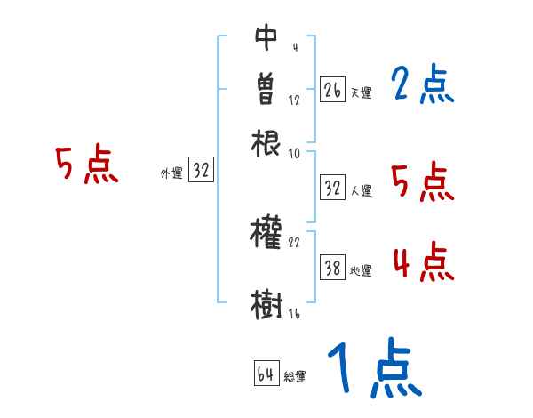 外運![]() | 中曽根權樹さんの外運は32画の5つ星!柔軟性があり成功する。チャンスが多く金運が良い。 生活面を象徴する運勢です。外部から受ける影響力を表し、結婚運、家庭運や職場、環境への順応性を表します。 |