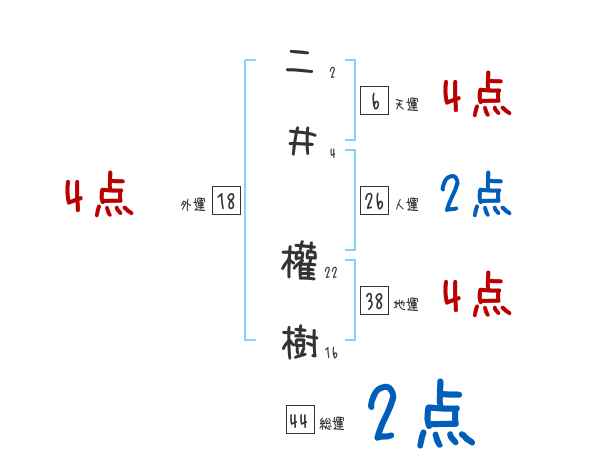 総運![]() | 二井權樹さんの総運は44画の2つ星!誠実で慎重な性格。物事を考えすぎないように注意しましょう。 あなたの人生を表す1番重要な運勢です。生涯を通じて影響する総合運となり、主に50歳以降の晩年期に影響を及ぼします。 |