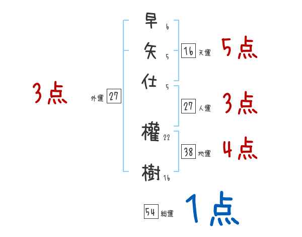 天運![]() | 早矢仕權樹さんの天運は16画の5つ星!人望が厚く大きく発展する。逆転成功が見える。 家系が持つ宿命的な運勢を表します。祖先から受け継いだ苗字ですので自分の力が及びません。家柄を象徴します。 |