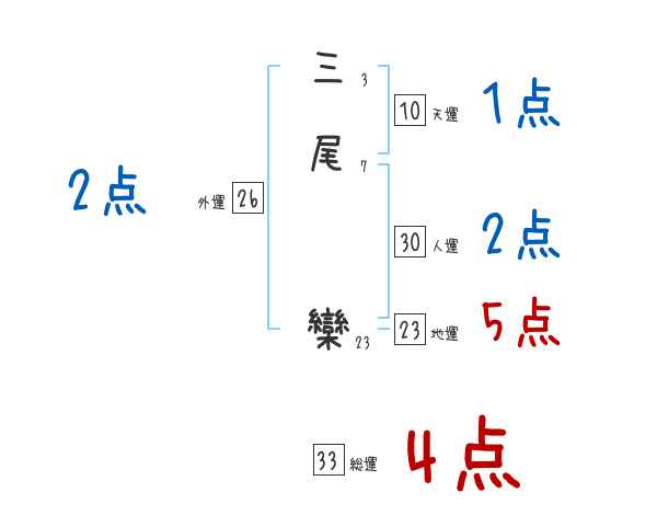 外運![]() | 三尾欒さんの外運は26画の2つ星!波瀾万丈かも。信頼できる人を大事にしましょう。 生活面を象徴する運勢です。外部から受ける影響力を表し、結婚運、家庭運や職場、環境への順応性を表します。 |
