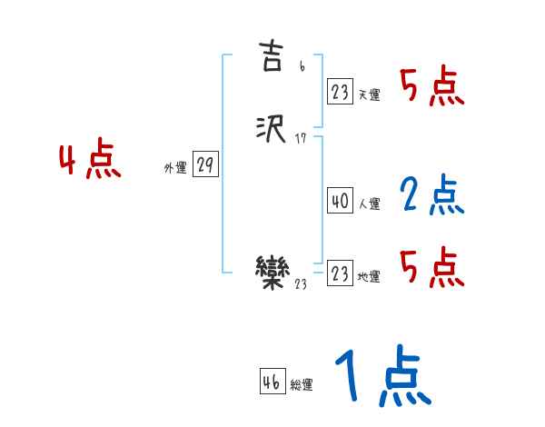 天運![]() | 吉沢欒さんの天運は23画の5つ星!想像力に優れ活力がある。一代で成功し名誉を手に入れる。 家系が持つ宿命的な運勢を表します。祖先から受け継いだ苗字ですので自分の力が及びません。家柄を象徴します。 |