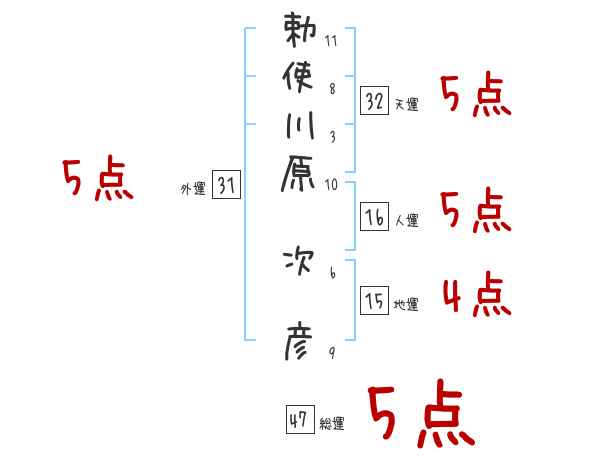 天運![]() | 勅使川原次彦さんの天運は32画の5つ星!柔軟性があり成功する。チャンスが多く金運が良い。 家系が持つ宿命的な運勢を表します。祖先から受け継いだ苗字ですので自分の力が及びません。家柄を象徴します。 |