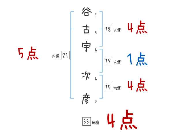 地運![]() | 谷古宇次彦さんの地運は15画の4つ星!人徳があり出世する。順調に物事を進め円満な人生。 個性を表す基礎的な運勢です。性格形成や対人関係、行動力など家庭環境に影響されます。主に誕生してから20歳くらいまでの若年期の運勢を表します。 |