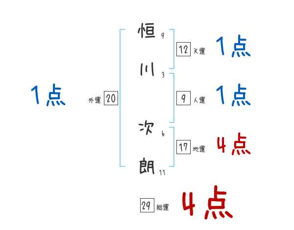 総運![]() | 恒川次朗さんの総運は29画の4つ星!完全主義で才能がある。厳格な心の持ち主。 あなたの人生を表す1番重要な運勢です。生涯を通じて影響する総合運となり、主に50歳以降の晩年期に影響を及ぼします。 |