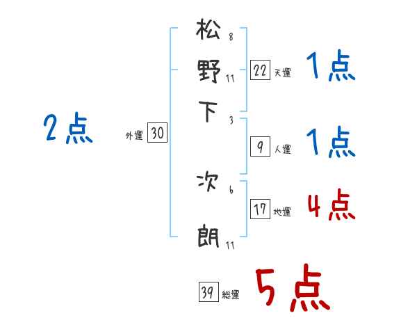 総運![]() | 松野下次朗さんの総運は39画の5つ星!社交性に優れ人望が厚い。人の上に立ち成功する。 あなたの人生を表す1番重要な運勢です。生涯を通じて影響する総合運となり、主に50歳以降の晩年期に影響を及ぼします。 |