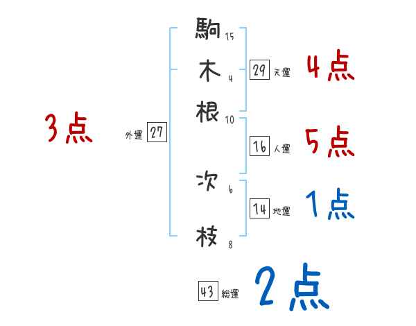 総運![]() | 駒木根次枝さんの総運は43画の2つ星!頑固な性格で独立心が強いかも。やや非現実的で浪費に注意しましょう。 あなたの人生を表す1番重要な運勢です。生涯を通じて影響する総合運となり、主に50歳以降の晩年期に影響を及ぼします。 |