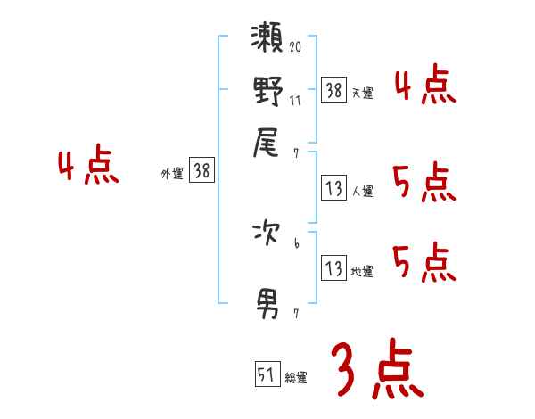 総運![]() | 瀬野尾次男さんの総運は51画の3つ星!変化が激しく、危険に注意。堅実な性格。 あなたの人生を表す1番重要な運勢です。生涯を通じて影響する総合運となり、主に50歳以降の晩年期に影響を及ぼします。 |