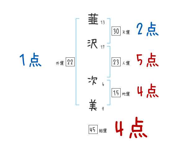 天運![]() | 韮沢次美さんの天運は30画の2つ星!浮き沈みの激しさに注意しましょう。 家系が持つ宿命的な運勢を表します。祖先から受け継いだ苗字ですので自分の力が及びません。家柄を象徴します。 |