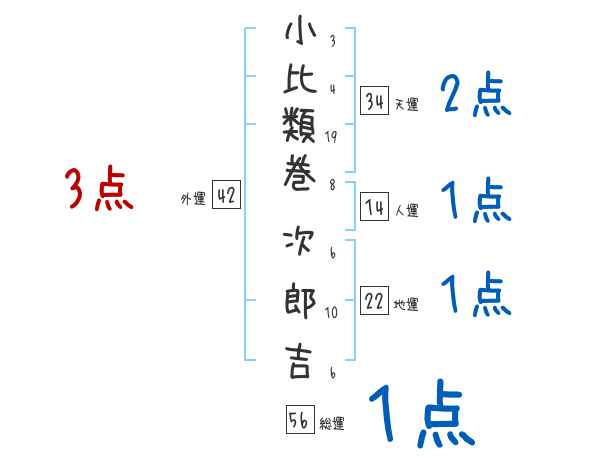 天運![]() | 小比類巻次郎吉さんの天運は34画の2つ星!独創性に優れるが、自尊心が強く災難に注意しましょう。 家系が持つ宿命的な運勢を表します。祖先から受け継いだ苗字ですので自分の力が及びません。家柄を象徴します。 |