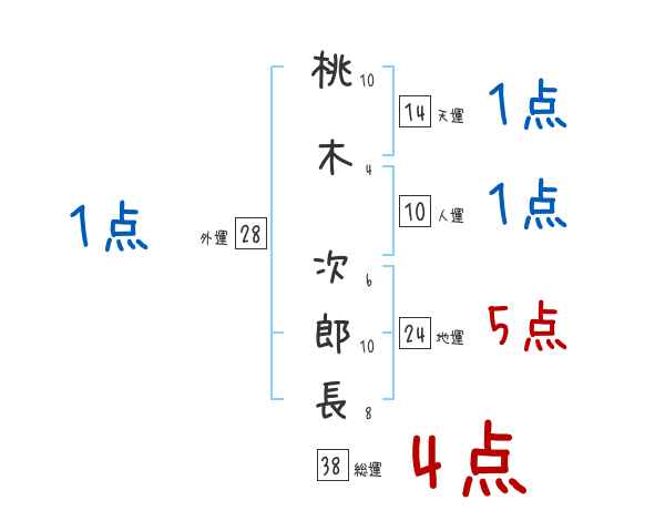 外運![]() | 桃木次郎長さんの外運は28画の1つ星!家庭環境に注意。スポーツで活躍できる能力があるかも。 生活面を象徴する運勢です。外部から受ける影響力を表し、結婚運、家庭運や職場、環境への順応性を表します。 |
