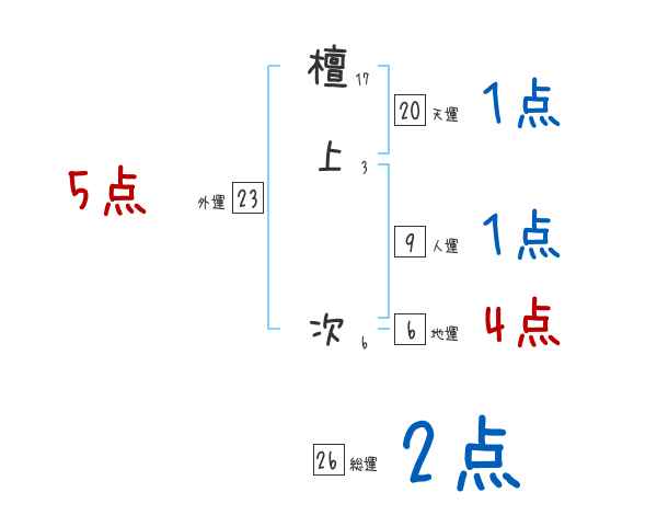 外運![]() | 檀上次さんの外運は23画の5つ星!想像力に優れ活力がある。一代で成功し名誉を手に入れる。 生活面を象徴する運勢です。外部から受ける影響力を表し、結婚運、家庭運や職場、環境への順応性を表します。 |