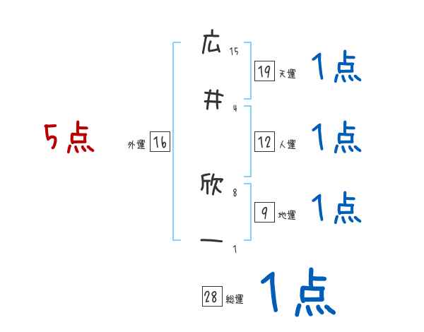 総運![]() | 広井欣一さんの総運は28画の1つ星!家庭環境に注意。スポーツで活躍できる能力があるかも。 あなたの人生を表す1番重要な運勢です。生涯を通じて影響する総合運となり、主に50歳以降の晩年期に影響を及ぼします。 |