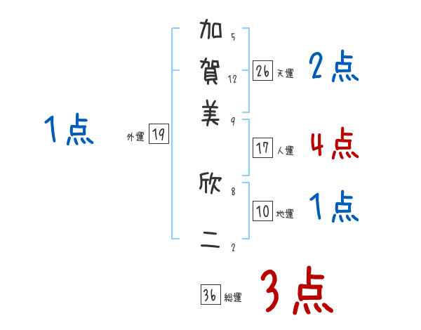 総運![]() | 加賀美欣二さんの総運は36画の3つ星!先見性が豊かです。多少神経質で苦労することも。 あなたの人生を表す1番重要な運勢です。生涯を通じて影響する総合運となり、主に50歳以降の晩年期に影響を及ぼします。 |