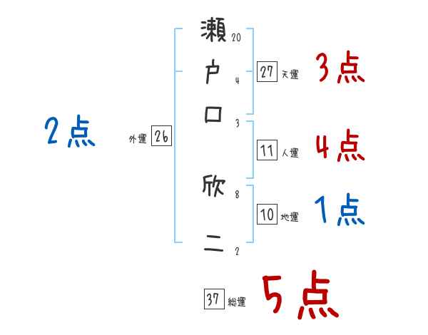 総運![]() | 瀬戸口欣二さんの総運は37画の5つ星!努力家で順応性に優れる。現実的な考え方ができ忠実に物事をこなす。 あなたの人生を表す1番重要な運勢です。生涯を通じて影響する総合運となり、主に50歳以降の晩年期に影響を及ぼします。 |