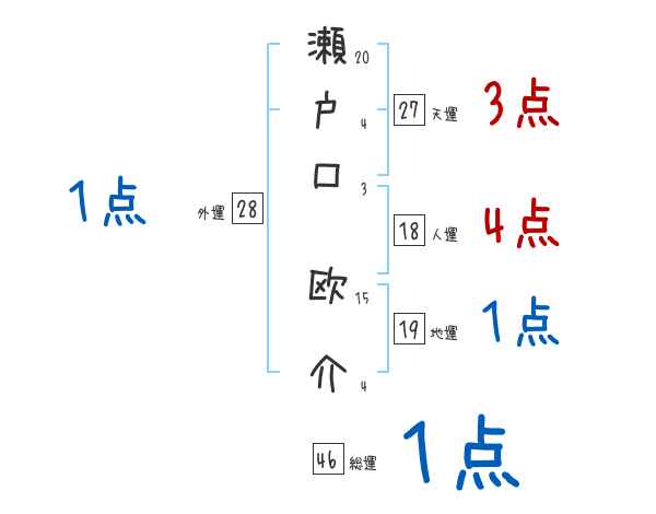 総運![]() | 瀬戸口欧介さんの総運は46画の1つ星!迷走することが多く苦労するかも。目先のことにとらわれないように。 あなたの人生を表す1番重要な運勢です。生涯を通じて影響する総合運となり、主に50歳以降の晩年期に影響を及ぼします。 |