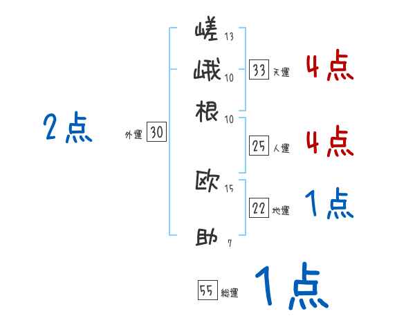 天運![]() | 嵯峨根欧助さんの天運は33画の4つ星!権力志向でプライドが高い。勇気があり運を切り開き成功する。 家系が持つ宿命的な運勢を表します。祖先から受け継いだ苗字ですので自分の力が及びません。家柄を象徴します。 |
