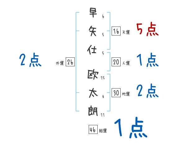 天運![]() | 早矢仕欧太朗さんの天運は16画の5つ星!人望が厚く大きく発展する。逆転成功が見える。 家系が持つ宿命的な運勢を表します。祖先から受け継いだ苗字ですので自分の力が及びません。家柄を象徴します。 |