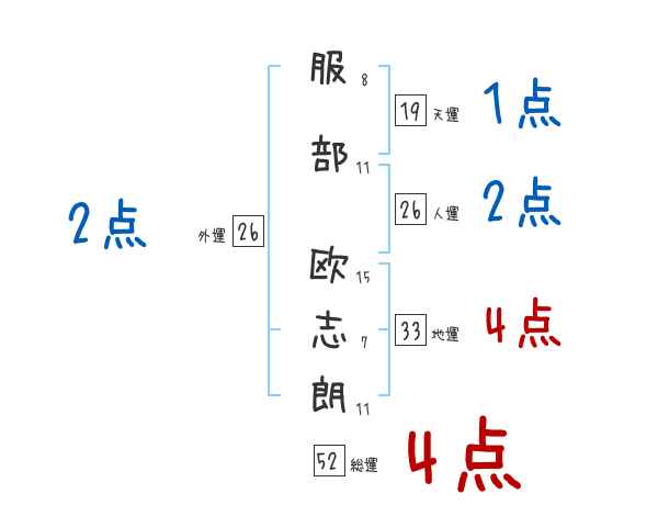 外運![]() | 服部欧志朗さんの外運は26画の2つ星!波瀾万丈かも。信頼できる人を大事にしましょう。 生活面を象徴する運勢です。外部から受ける影響力を表し、結婚運、家庭運や職場、環境への順応性を表します。 |