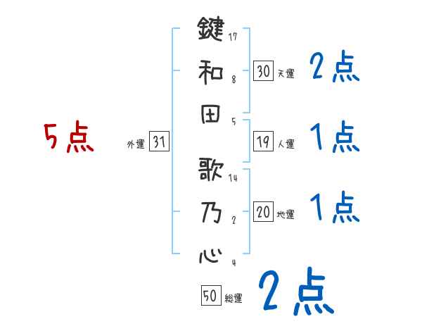 外運![]() | 鍵和田歌乃心さんの外運は31画の5つ星!社交性があり判断力に優れる。順風満帆な人生で円満な生活。 生活面を象徴する運勢です。外部から受ける影響力を表し、結婚運、家庭運や職場、環境への順応性を表します。 |