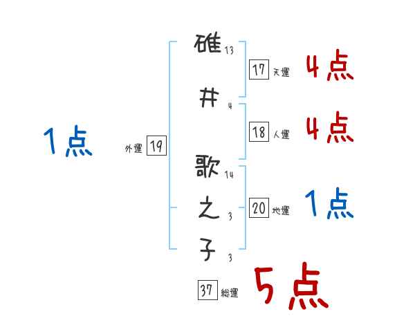 外運![]() | 碓井歌之子さんの外運は19画の1つ星!優れた才能を持ちますが、協調性が足りないことも。周りの人と協力する事を意識しましょう。 生活面を象徴する運勢です。外部から受ける影響力を表し、結婚運、家庭運や職場、環境への順応性を表します。 |