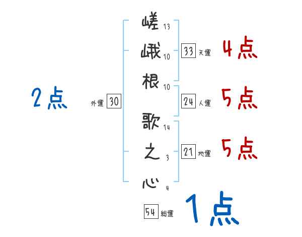総運![]() | 嵯峨根歌之心さんの総運は54画の1つ星!トラブルが多いかも。周りをよく見て協調して過ごしましょう。 あなたの人生を表す1番重要な運勢です。生涯を通じて影響する総合運となり、主に50歳以降の晩年期に影響を及ぼします。 |