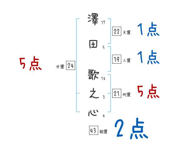 外運![]() | 澤田歌之心さんの外運は24画の5つ星!家庭運が良く順調な人生。金運にも恵まれる。 生活面を象徴する運勢です。外部から受ける影響力を表し、結婚運、家庭運や職場、環境への順応性を表します。 |