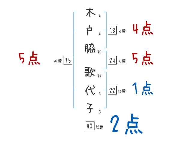 外運![]() | 木戸脇歌代子さんの外運は16画の5つ星!人望が厚く大きく発展する。逆転成功が見える。 生活面を象徴する運勢です。外部から受ける影響力を表し、結婚運、家庭運や職場、環境への順応性を表します。 |